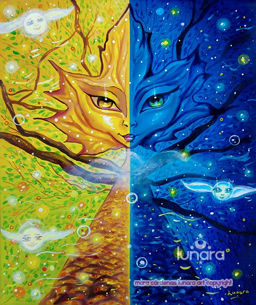 Las imágenes que vienen en el ojo de mi mente son las que plasmo en el lienzo, colores, símbolos, paisajes, formas. En el proceso de realización vienen surgiendo otros detalles que se plasman en el lienzo.